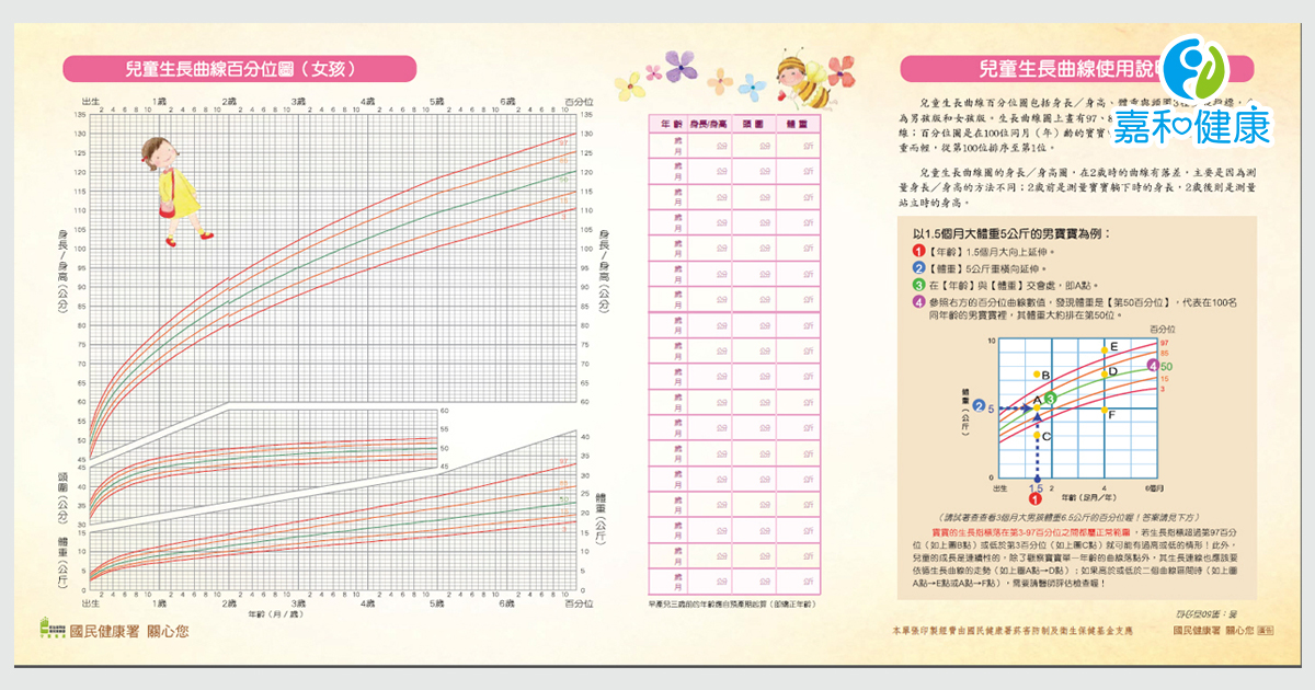 為了讓民眾知道兒童的生長情況,國民健康署特地繪製兒童生長曲線圖,根據性別,分男女兩版。民眾可以將自家孩子的生長資料與圖中的資料進行比對,即可知道自家孩子當前的生長情況在同齡人中屬於正常、落後還是領先。