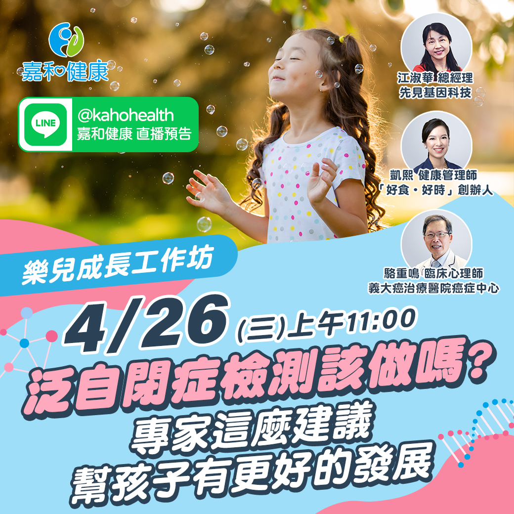 3月全新一季「樂兒成長工作坊」—由專家引領透過基因解碼,瞭解遺傳對健康規劃的重要性,及早掌握個人身體狀況,讓父母精準看見孩子的需要,預知可能的疾病風險,給予孩子良好的健康指引,一起揭開基因秘密,掌握孩子關鍵成長力!