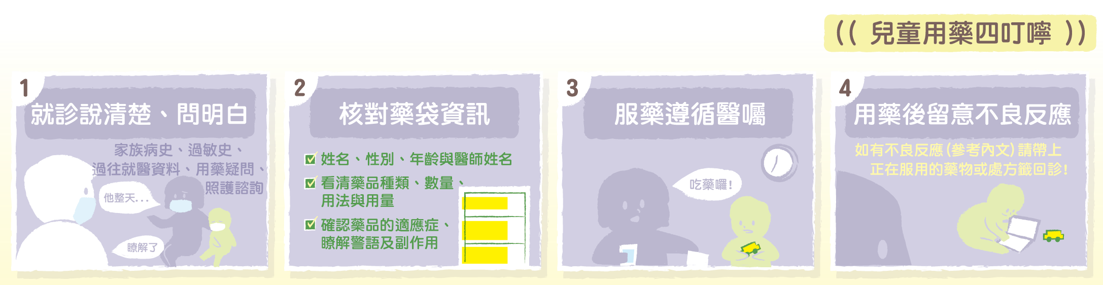 食藥署提出小口訣:「生病看醫師,用藥問藥師。」尤其兒童的身體器官尚未發育成熟,對藥品的吸收、分布、代謝等皆與成人不同,若沒有正確使用,很可能影響療效,甚至增加不良反應的發生!