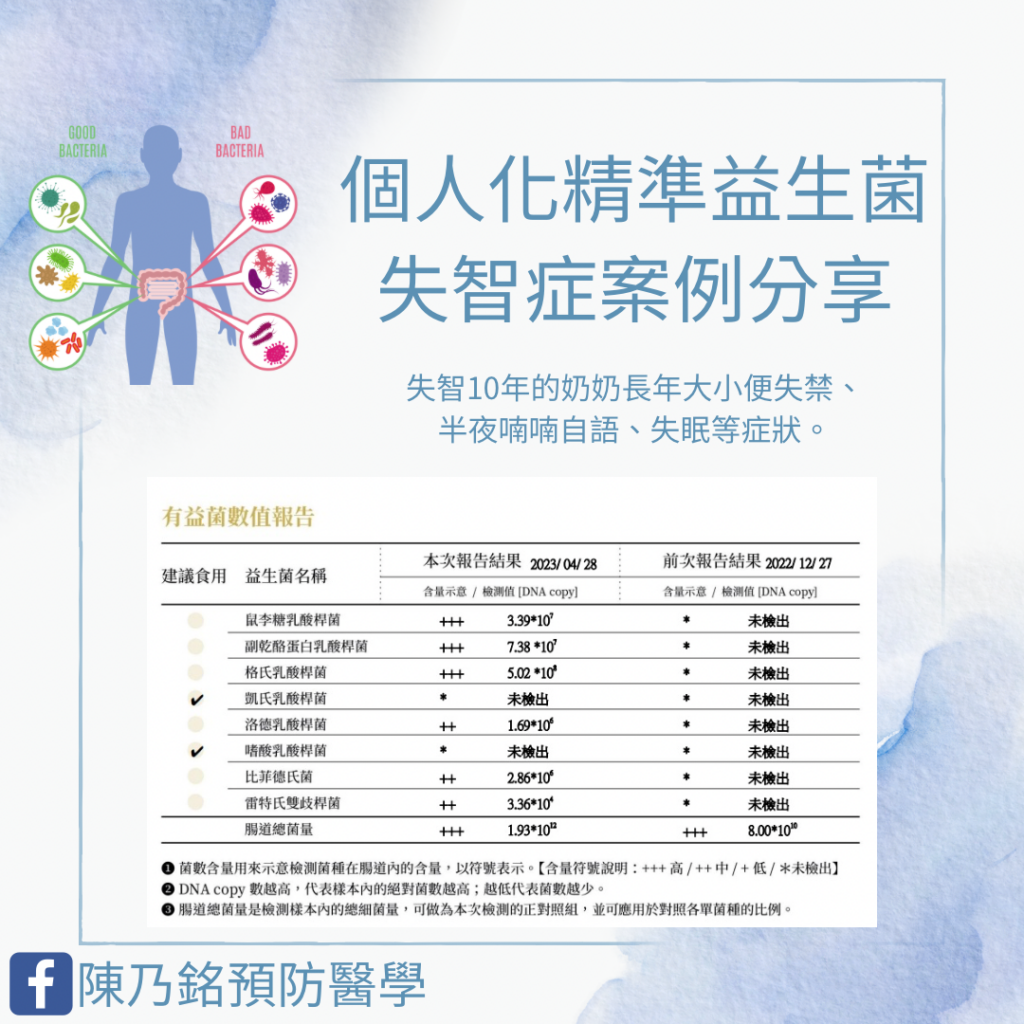 在臨床上,這位奶奶的症狀有了明顯改善,她的糞便與尿液的意味減少,她在半夜不再喃喃自語,不必依賴安眠藥也可以睡過整夜。她的眼神也能夠追蹤人,同時也能夠認出自己的兒子,並叫出他的名字。這些結果顯示,菌種補充可以對改善失智症患者的症狀產生積極的影響,而這種改變也可能來自於不同的菌種之間的協同作用。