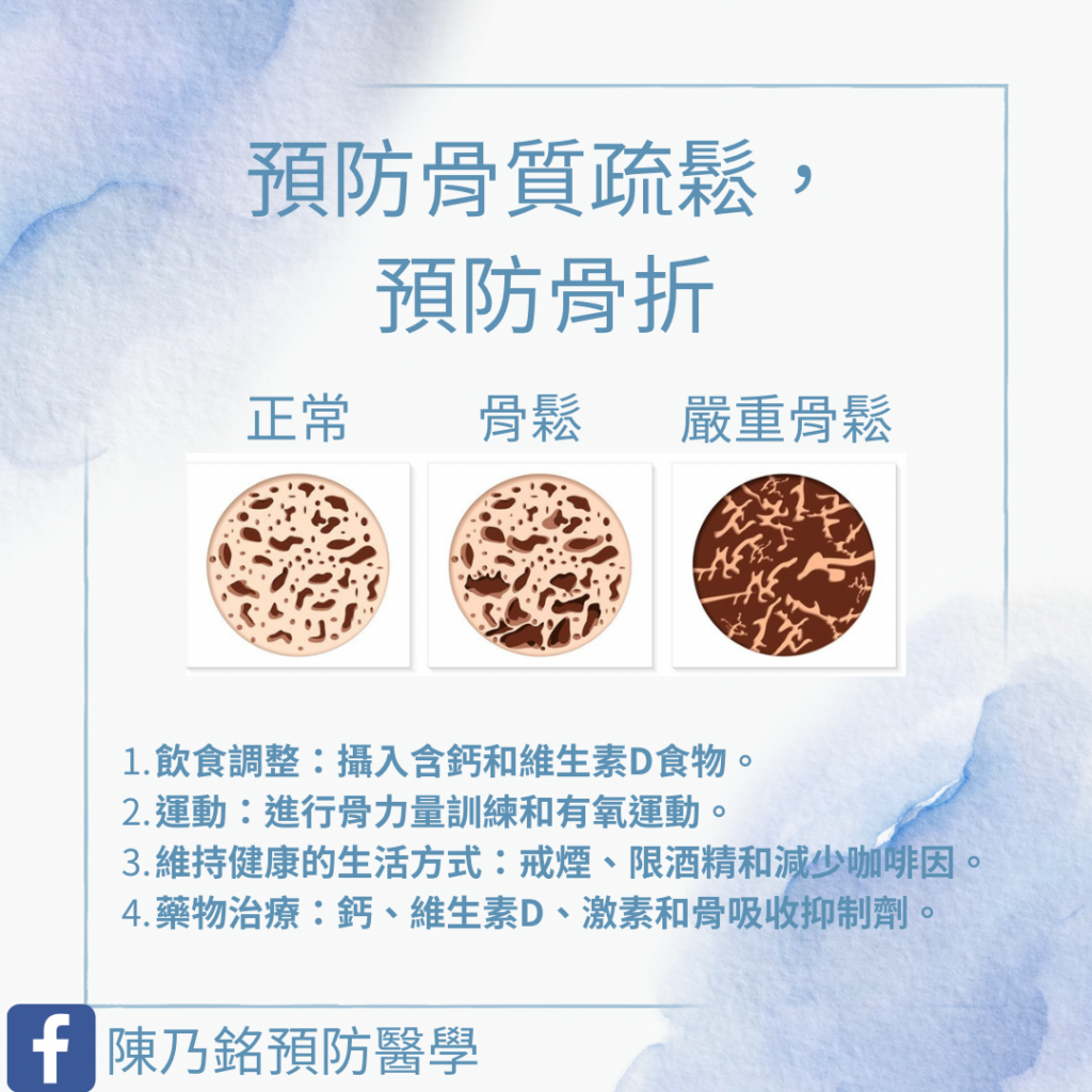針對有骨質疏鬆患者建議下列預防措施,藉此幫助提高或維持骨質密度。