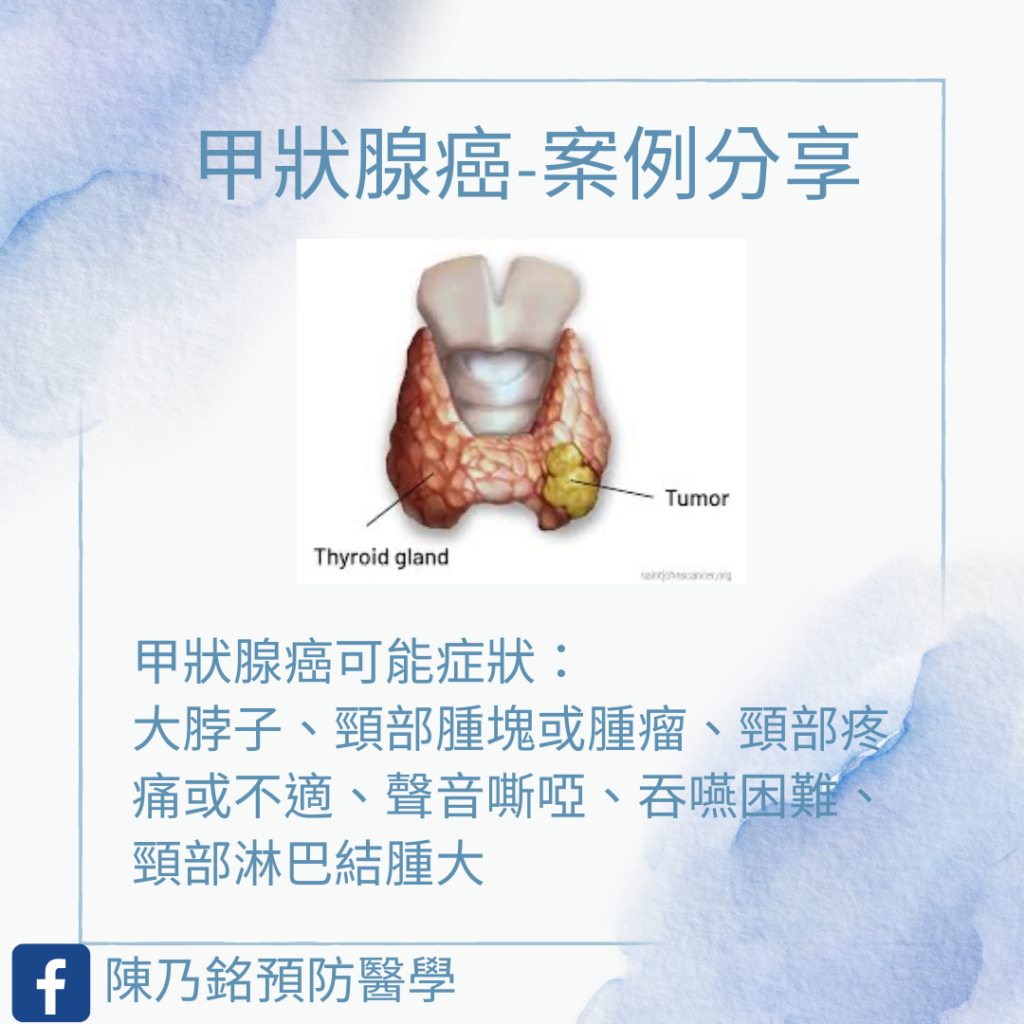 有一個四十多歲男性,兩年前因為頸部不適被診斷乳頭狀甲狀腺癌,醫師當時就建議病人開刀處理,之後病人沒有回去醫院接受手術及追蹤。
