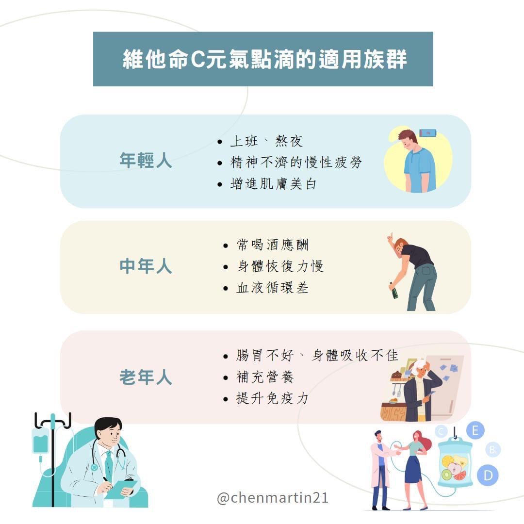 其實不只是針對癌友,大家都能透過施打維他命C元氣點滴,增進身體血液循環、幫助細胞代謝,能補充體內的營養素。可以達到改善身體不適、消除疲勞、抗老化的效果~也能當作身體的保養!