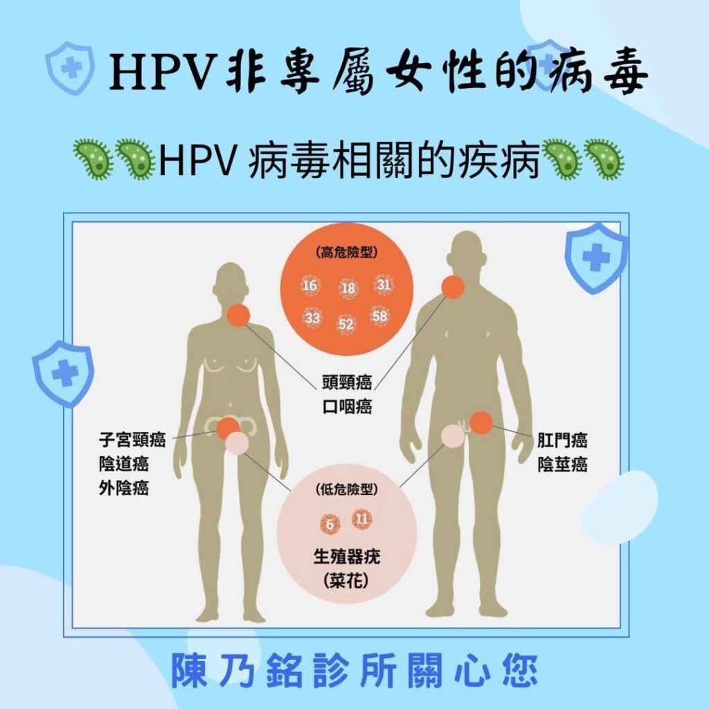 不只女生會感染HPV、男性也會感染HPV,造成女性子宮頸癌為高風險HPV16、18型; 在感染低風險HPV6、11後可能造成的疾病包括扁平疣、生殖器疣(菜花)。
